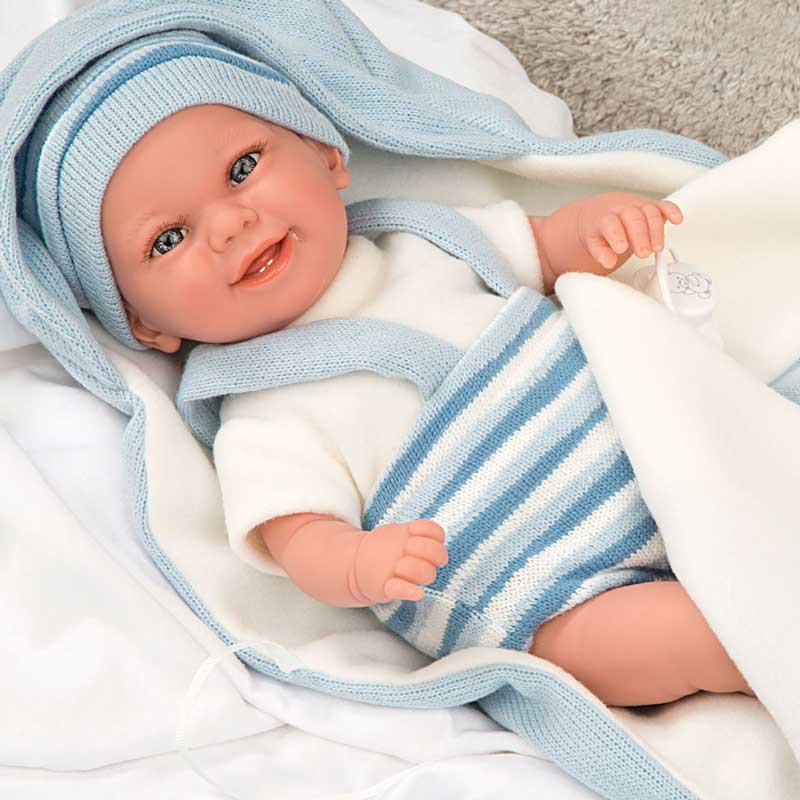Запознайте се с очарователната жива кукла – бебе от серията “Elegance” на испанската марка Arias. Ръчно изработена, тя е малко произведение на изкуството, толкова реалистична, че изглежда като истинска. Тялото е меко, а ръцете, крачетата и главичката са от мек висококачествен винил с аромат на ванилия. Специално внимание е отделено на всеки детайл като зачервявания и несъвършенства по кожата, а теглото е като на реално бебе. Облечено е в бяла блузка и светлосиньо плетено гащеризонче с шапчица. Идеален подарък за всяко дете, което ще се забавлява докато играе с него, гушка и приспива.